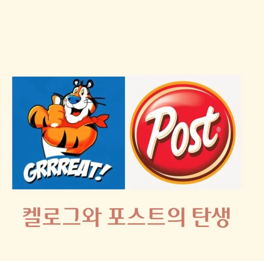 어느날 여느때처럼 아침에 그래놀라를 환자들에게 제공하려고 통밀가루로 만든 반죽을 잠시 두고 자리를 비우게되었는데 그 사이 반죽이 너무 오래 가만히 두게되어서 숙성이 되고 신선도가 떨어지게 되자 나중에 존하비 켈로그는 "버려야하나?" 하고 한참을 고민하다가 "재료도 그렇고 너무 아까운데 버리지 말고 한번 롤러에 돌려서 국수나 만들어 먹자"라고 생각하고 롤러에 돌렸는데 갑자기 예상외로 자신이 생각하던 국수가 아닌 엉뚱하게도 바삭 바삭한 식감으로 조각되고 분리된 곡물이 나누어져 나왔고 이것을 "콘플레이크" 라고 부르면서 우유와 함께 제공했더니 환자들에게 엄청난 인기를 끌게되면서 이 "콘플레이크"가 큰호응을 일으키는데 그 인기는 심지어 퇴원을 앞둔 환자마저 "콘플레이크"를 싸갈 수 있냐고 할정도였는데요 아니 환자음식이 집음식보다 맛있어도 되는 건가요? 퇴원을 하기싫겠는데? 어쨌든 그에따라 형인 윌리엄 케이스 켈로그는 옥수수를 사용해서 더 맛있고 간편하게 "콘플레이크"를 만들어보기로 하는데 이것 역시 반응이 너무 좋았다고 하죠 이래서 우리가 아는 호랑이 마스코트가 그려진 콘플레이크 씨리얼을 파는 "켈로그"회사가 1906년 설립된다는 것까지가 우리가 알고있는 사실인데요 그런데 여기 숨겨진 이야기가 하나 더 있습니다 비하인드 스토리로 사실 콘플레이크 씨리얼을 판매하는 회사는 "켈로그"회사가 최초가 아니었다는 것 알고계신가요? 원래는 켈로그 형제가 운영하던 요양병원에 입원했던 한 환자가 있었는데요 그는 미국에서 사업을 진행해왔었지만 부도와 계속되는 사업의 실패로 정신적 충격과 좌절때문에 그만 후유증으로 우울증이 심하게 오고 무기력과 신경쇠약을 앓고 있던 환자였습니다 그의 이름은 "찰스 윌리엄 포스트[Charles William Post]"였습니다 어디서 익숙한 글자가 보이지 않으시나요? 네 이 찰스 윌리엄 포스트는 켈로그 형제의 요양병원에서 콘플레이크를 맛보는 순간 눈이 번쩍 뜨이게됩니다 "아니~!이 맛은?" 찰스 윌리엄 포스트가 처음으로 맛본 콘플레이크는 신선한 충격과 함께 엄청난 사업아이템이 그의 머리를 순간 스쳐갔고 그 결과 우울증과 신경쇠약까지도 빠르게 호전되어 삶의 동기부여가 생긴 그는 레시피를 켈로그 형제의 요양병원에서 우연히 머릿속에 가득 담아 벤치 마케팅을 시전하기위해 퇴원하게 되었고 그야말로 "인생사 9회말 투아웃부터" 라고 했던가? 1895년 미시건주 배틀크릭에서 찰스 윌리엄 포스트는 포스텀 씨리얼 컴패니[Postum Cerials Company] 라는 회사를 설립한후 1897년 씨리얼인 "그레이프 너츠"라는 씨리얼을 세계최초로 출시하면서 초대박이 나게됩니다 그에 따라 탄탄대로를 가게된 그의 회사는 1).젤오젤라틴[Jell-O gelatin]과 2).베이커즈 초콜렛[Baker's chocolate] 그리고